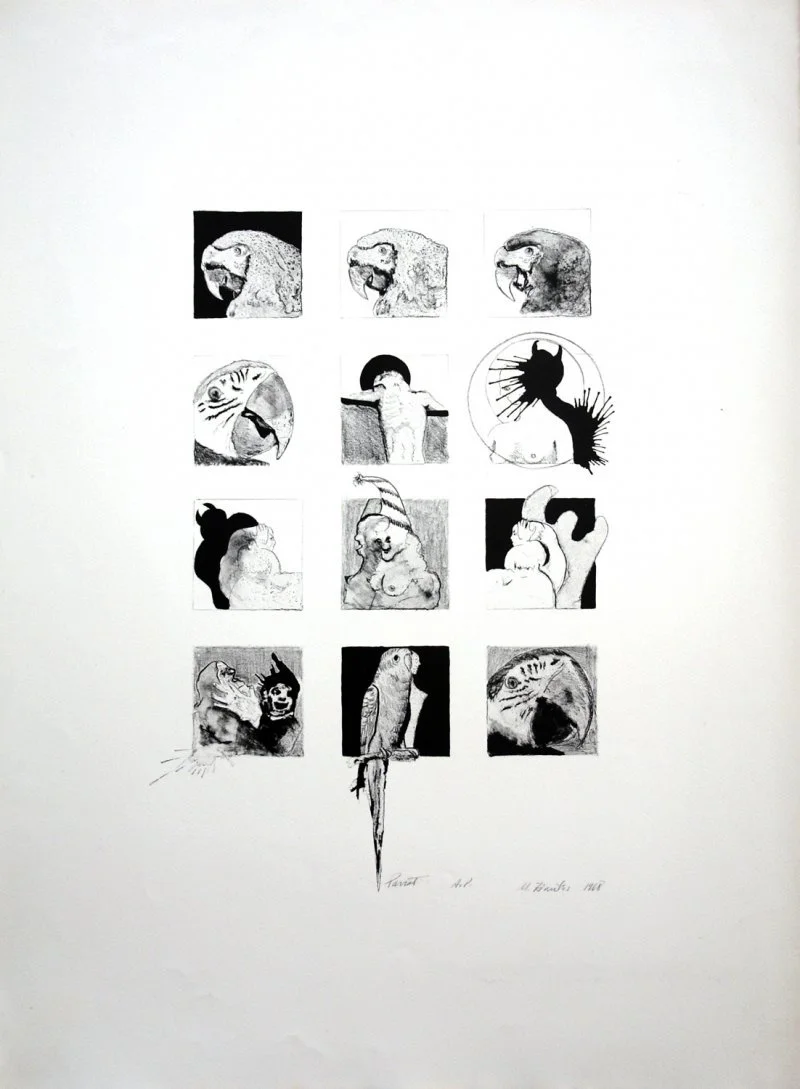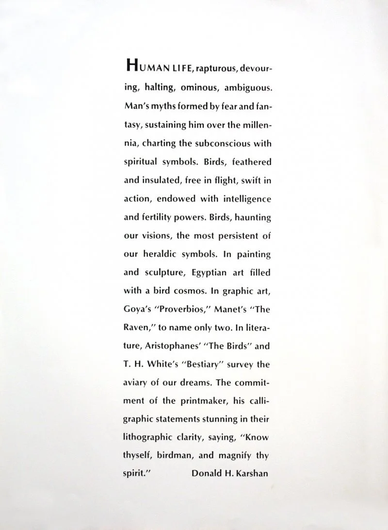 Human life, rapturous, devouring, halting, ominous, ambiguous, Man's myths formed by fear and fantasy, sustaining him over the millennia, charting the subconscious with spiritual symbols. Birds, feathered and insulated, free in flight, swift in action, endowed with intelligence and fertility powers. Birds, haunting our visions, the most persistent of our heraldic symbols. In painting and sculpture, Egyptian art filled with a bird cosmos. In graphic art, Goy's "Proverbios", Manet's "The Raven," to name only two. In literature, Aristophanes, "The Birds" and T.H. White's "Bestiary" survey the aviary of our dreams. The commitment of the printmaker, his calligraphic statements stunning in their lithographic clarity, saying, "know thyself, birdman, and magnify thy spirit."